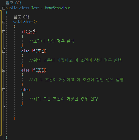 위의 사진처럼 if문이 참이면 아래 구문을 실행하고, 그렇지 않으면 else if문을, 모든 조건들이 참이 아닐시에는 else문을 실행하게 됩니다. 그렇기 때문에 else문에는 따로 조건이 필요하지 않습니다.